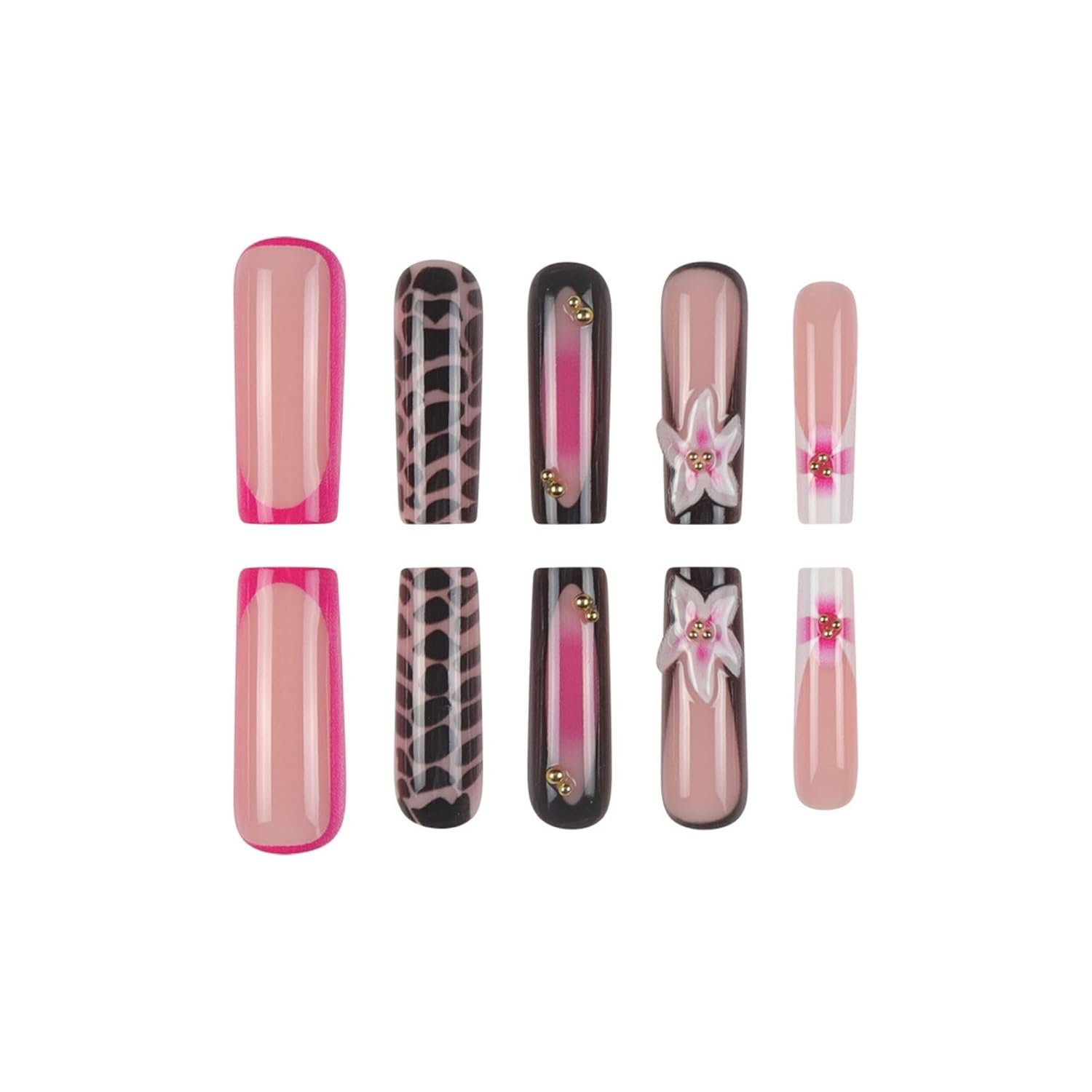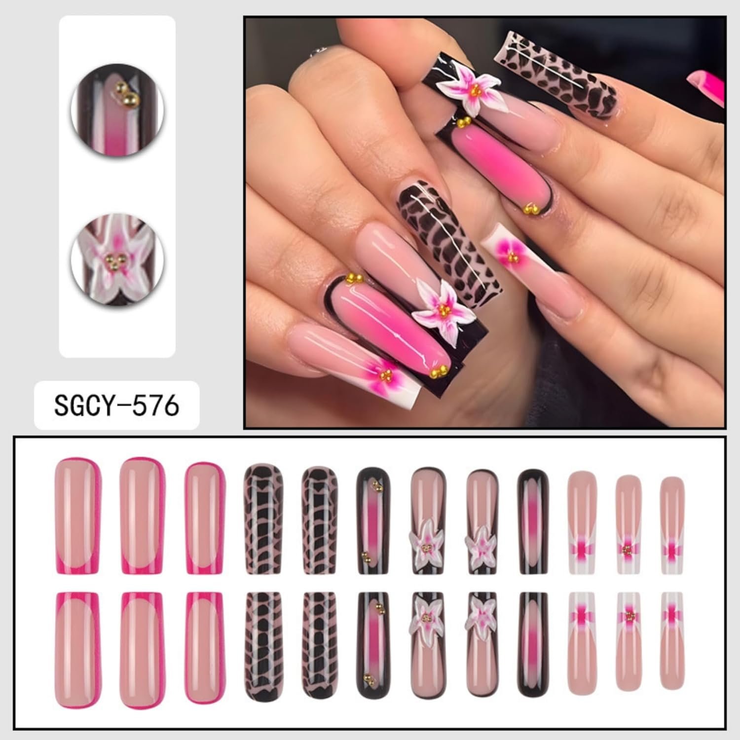 Press on Nails Pink Long Square with Flowers